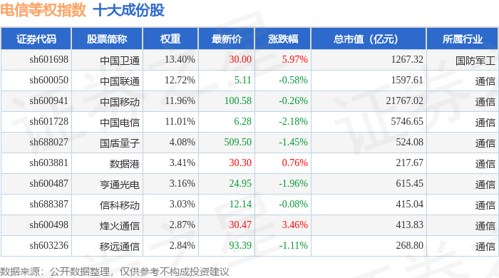 证券之星消息,12月29日,电信等权(000078)指数报收于3428.52点,涨0.55%,成交402.44亿元,换手率1.04%。当日该指数成份股中,上涨的有9家,剑桥科技以6.33%的涨幅领涨,下跌的有23家,山东出版以2.44%的跌幅领跌。