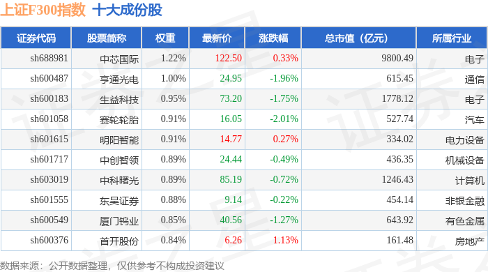 证券之星消息,12月29日,上证F300(000099)指数报收于9108.77点,跌0.44%,成交1753.25亿元,换手率1.49%。当日该指数成份股中,上涨的有75家,五矿发展以10.03%的涨幅领涨,下跌的有211家,新凤鸣以5.38%的跌幅领跌。
