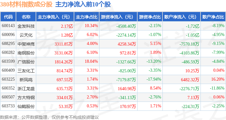资金流向方面,380材料(000105)指数成份股当日主力资金净流出合计14.54亿元,游资资金净流入合计4.02亿元,散户资金净流入合计10.52亿元。成份股资金流向详情见下表: