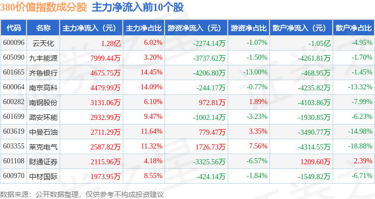 资金流向方面,380价值(000118)指数成份股当日主力资金净流出合计21.09亿元,游资资金净流入合计5.32亿元,散户资金净流入合计15.77亿元。成份股资金流向详情见下表:
