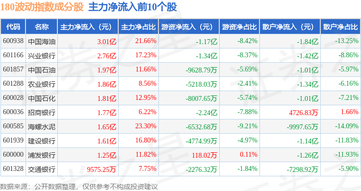 资金流向方面,180波动(000129)指数成份股当日主力资金净流出合计14.74亿元,游资资金净流入合计13.58亿元,散户资金净流入合计1.16亿元。成份股资金流向详情见下表: