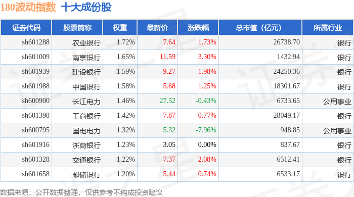 证券之星消息,12月29日,180波动(000129)指数报收于15258.03点,跌0.12%,成交805.91亿元,换手率0.31%。当日该指数成份股中,上涨的有40家,中国国航以4.36%的涨幅领涨,下跌的有55家,国电电力以7.96%的跌幅领跌。