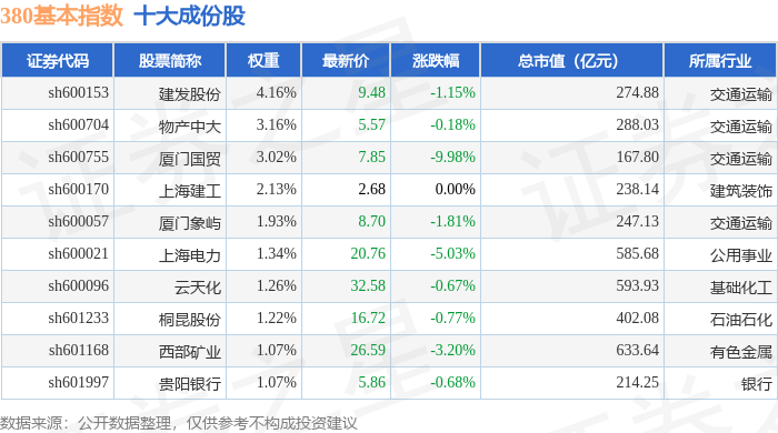 证券之星消息,12月29日,380基本(000128)指数报收于9079.48点,跌0.87%,成交2190.61亿元,换手率1.64%。当日该指数成份股中,上涨的有110家,九丰能源以10.01%的涨幅领涨,下跌的有255家,厦门国贸以9.98%的跌幅领跌。