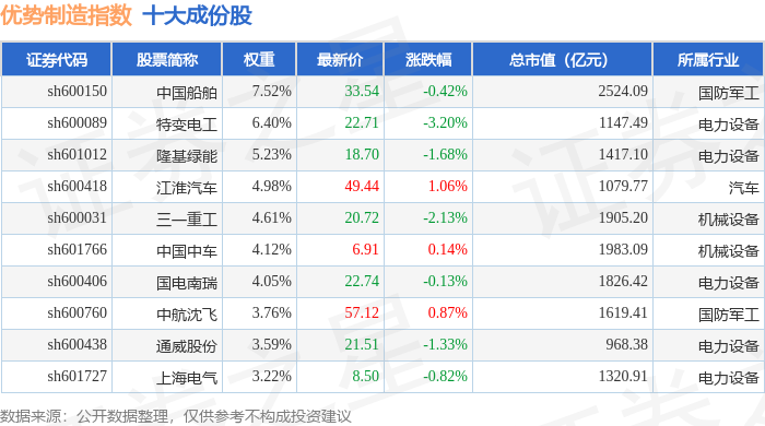 证券之星消息,12月29日,优势制造(000146)指数报收于7881.55点,跌0.19%,成交811.42亿元,换手率1.97%。当日该指数成份股中,上涨的有22家,五洲新春以10.0%的涨幅领涨,下跌的有26家,阿特斯以5.2%的跌幅领跌。