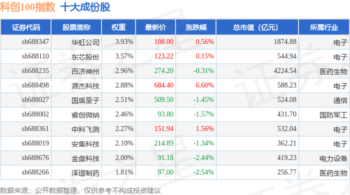 科创100(000698)指数十大成份股详情如下: