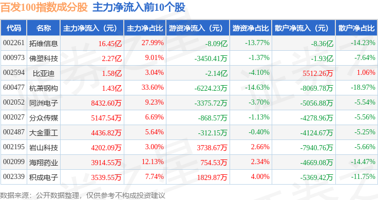 资金流向方面,百发100(000851)指数成份股当日主力资金净流出合计2528.99万元,游资资金净流出合计6.6亿元,散户资金净流入合计6.85亿元。成份股资金流向详情见下表: