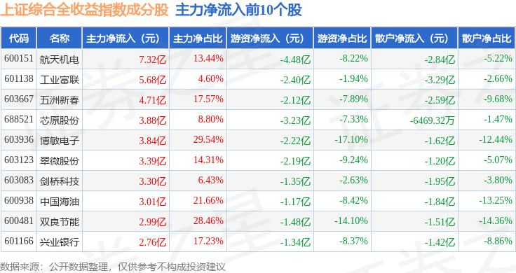 资金流向方面,上证综合全收益(000888)指数成份股当日主力资金净流出合计292.65亿元,游资资金净流入合计68.91亿元,散户资金净流入合计223.74亿元。成份股资金流向详情见下表: