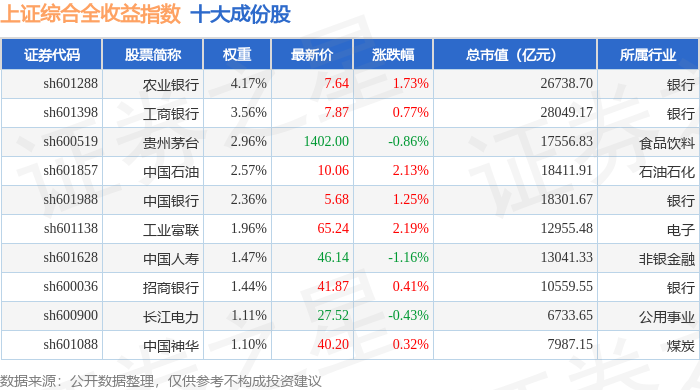 上证综合全收益(000888)指数十大成份股详情如下: