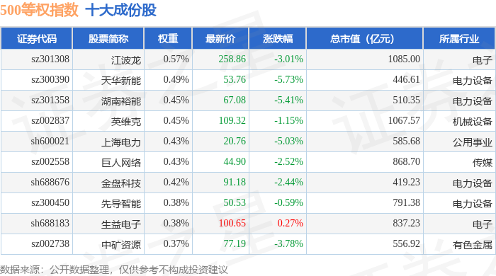 证券之星消息,12月29日,500等权(000982)指数报收于9000.0点,跌0.39%,成交3904.46亿元,换手率1.78%。当日该指数成份股中,上涨的有142家,迈为股份以20.0%的涨幅领涨,下跌的有339家,欣旺达以11.39%的跌幅领跌。