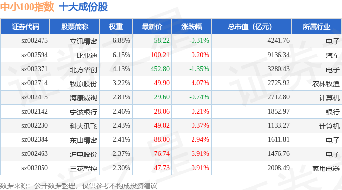 中小100(399005)指数十大成份股详情如下: