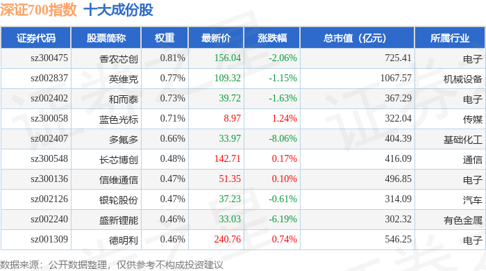 深证700(399010)指数十大成份股详情如下: