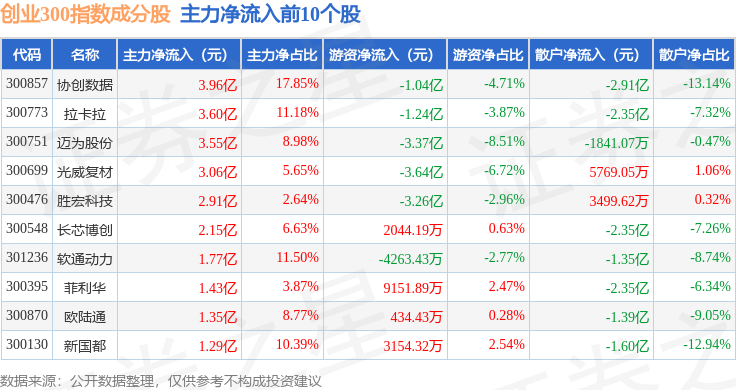 资金流向方面,创业300(399012)指数成份股当日主力资金净流出合计117.15亿元,游资资金净流入合计38.3亿元,散户资金净流入合计78.86亿元。成份股资金流向详情见下表: