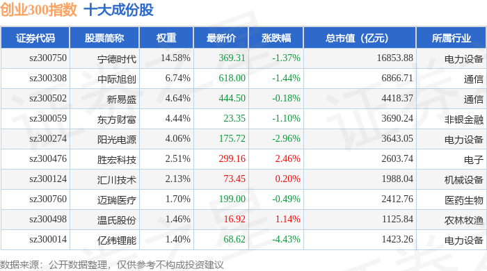证券之星消息,12月29日,创业300(399012)指数报收于4529.4点,跌0.55%,成交3143.88亿元,换手率3.18%。当日该指数成份股中,上涨的有116家,迈为股份以20.0%的涨幅领涨,下跌的有179家,欣旺达以11.39%的跌幅领跌。