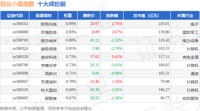 证券之星消息,12月29日,创业小盘(399020)指数报收于1768.66点,涨0.06%,成交928.76亿元,换手率4.47%。当日该指数成份股中,上涨的有123家,英飞特以20.0%的涨幅领涨,下跌的有172家,漱玉平民以17.91%的跌幅领跌。
