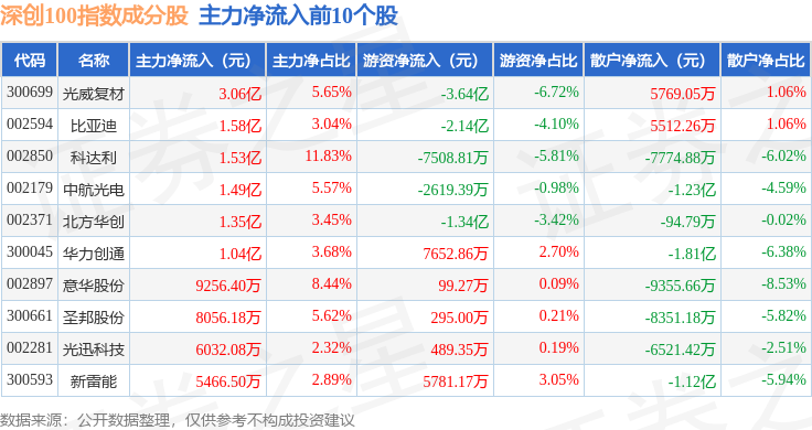 资金流向方面,深创100(399088)指数成份股当日主力资金净流出合计85.7亿元,游资资金净流入合计22.75亿元,散户资金净流入合计62.95亿元。成份股资金流向详情见下表: