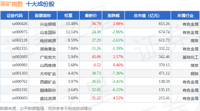 证券之星消息,12月29日,采矿指数(399232)报收于3998.62点,跌1.29%,成交210.85亿元,换手率2.73%。当日该指数成份股中,上涨的有10家,盛达资源以4.52%的涨幅领涨,下跌的有18家,国城矿业以9.65%的跌幅领跌。