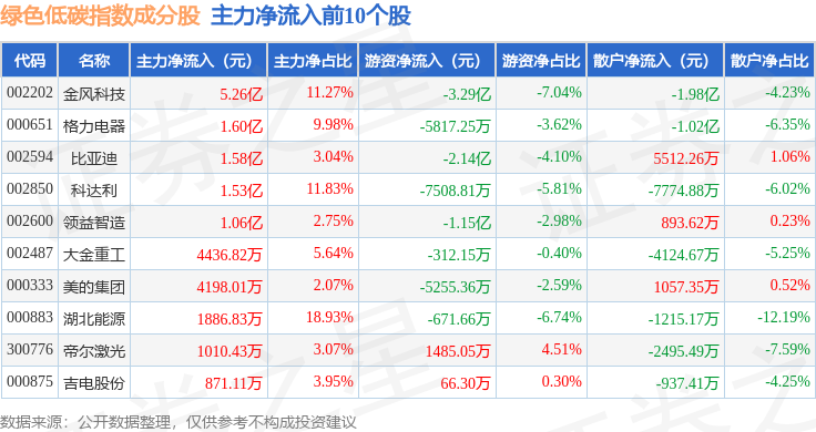 资金流向方面,绿色低碳(399258)指数成份股当日主力资金净流出合计83.93亿元,游资资金净流入合计16.2亿元,散户资金净流入合计67.73亿元。成份股资金流向详情见下表: