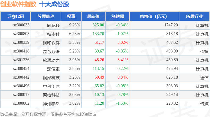 创业软件(399264)指数十大成份股详情如下: