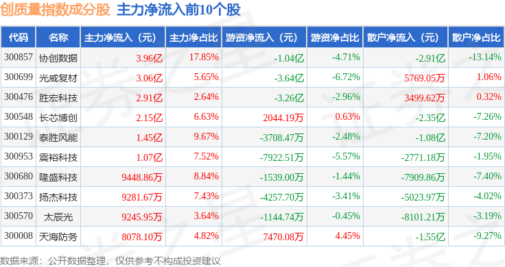 资金流向方面,创质量(399269)指数成份股当日主力资金净流出合计59.37亿元,游资资金净流入合计25.38亿元,散户资金净流入合计33.99亿元。成份股资金流向详情见下表: