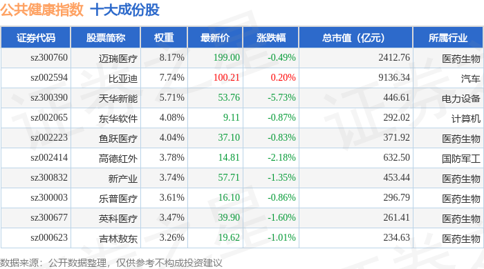 公共健康(399277)指数十大成份股详情如下: