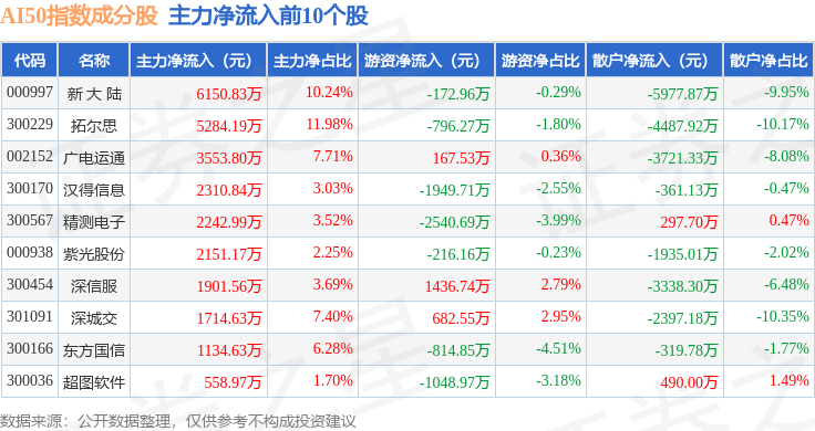 资金流向方面,AI50(399284)指数成份股当日主力资金净流出合计35.82亿元,游资资金净流入合计9.92亿元,散户资金净流入合计25.9亿元。成份股资金流向详情见下表: