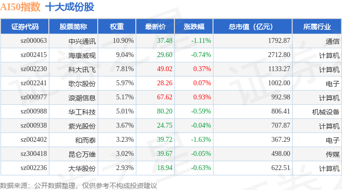 证券之星消息,12月29日,AI50(399284)指数报收于3754.54点,跌0.36%,成交440.72亿元,换手率2.1%。当日该指数成份股中,上涨的有15家,新大陆以2.45%的涨幅领涨,下跌的有35家,科大国创以2.91%的跌幅领跌。