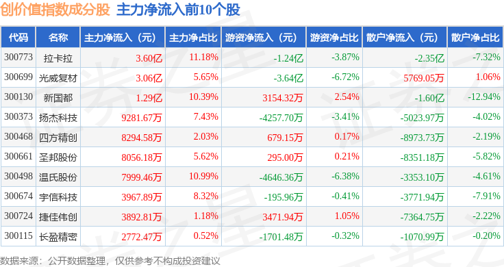 资金流向方面,创价值(399295)指数成份股当日主力资金净流出合计47.24亿元,游资资金净流入合计12.56亿元,散户资金净流入合计34.68亿元。成份股资金流向详情见下表: