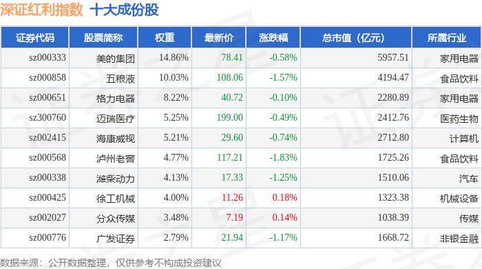 证券之星消息,12月29日,深证红利(399324)指数报收于9150.67点,跌1.0%,成交288.5亿元,换手率1.09%。当日该指数成份股中,上涨的有5家,龙佰集团以1.04%的涨幅领涨,下跌的有34家,神火股份以3.61%的跌幅领跌。