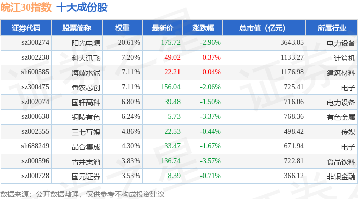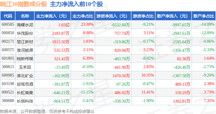 资金流向方面,皖江30(399350)指数成份股当日主力资金净流出合计27.74亿元,游资资金净流入合计5.99亿元,散户资金净流入合计21.75亿元。成份股资金流向详情见下表: