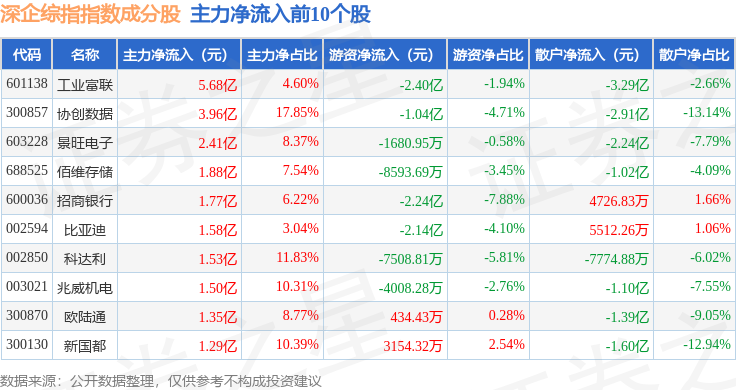 资金流向方面,深企综指(399352)指数成份股当日主力资金净流出合计62.03亿元,游资资金净流入合计5.49亿元,散户资金净流入合计55.85亿元。成份股资金流向详情见下表: