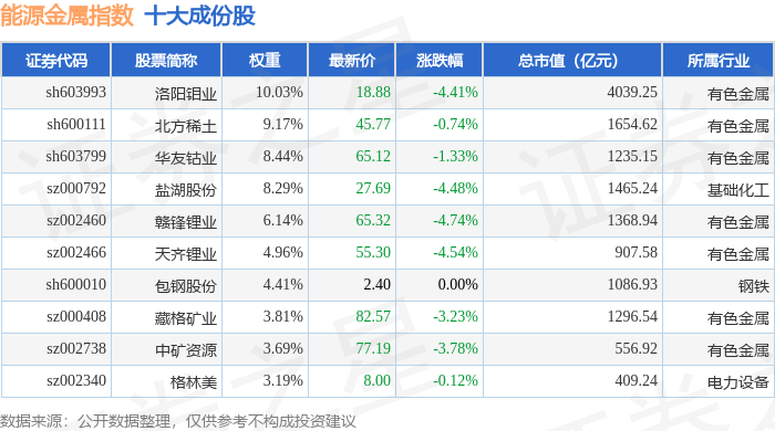 能源金属(399366)指数十大成份股详情如下: