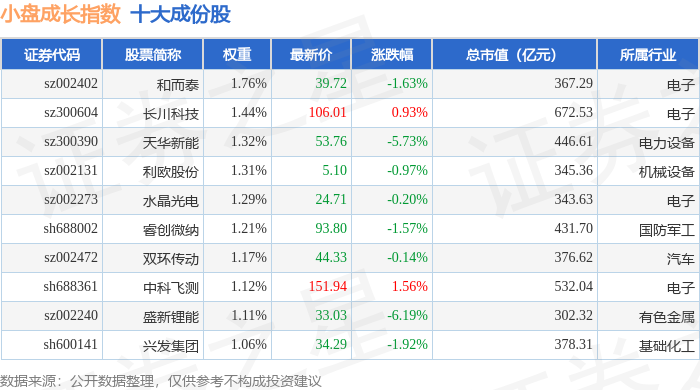 证券之星消息,12月29日,小盘成长(399376)指数报收于6301.32点,跌0.47%,成交1187.5亿元,换手率2.51%。当日该指数成份股中,上涨的有49家,迈为股份以20.0%的涨幅领涨,下跌的有116家,雅化集团以8.8%的跌幅领跌。