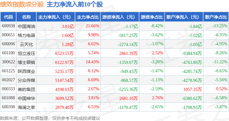 资金流向方面,绩效指数(399398)成份股当日主力资金净流出合计22.31亿元,游资资金净流入合计9.62亿元,散户资金净流入合计12.69亿元。成份股资金流向详情见下表:
