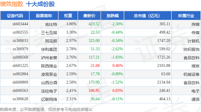 绩效指数(399398)十大成份股详情如下: