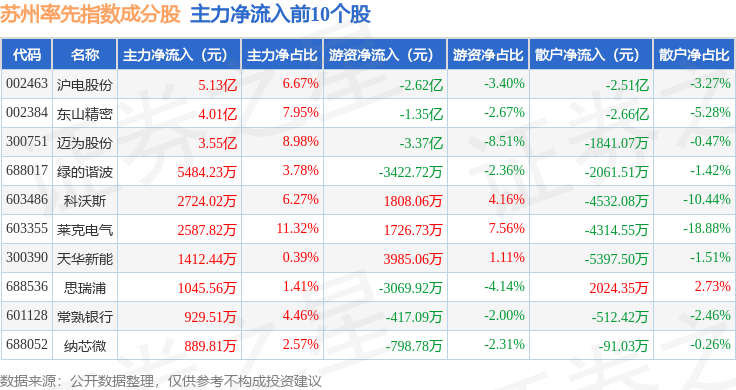 资金流向方面,苏州率先(399410)指数成份股当日主力资金净流出合计4.71亿元,游资资金净流出合计3.14亿元,散户资金净流入合计7.85亿元。成份股资金流向详情见下表: