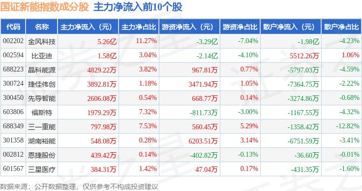 资金流向方面,国证新能(399412)指数成份股当日主力资金净流出合计63.28亿元,游资资金净流入合计14.58亿元,散户资金净流入合计48.7亿元。成份股资金流向详情见下表: