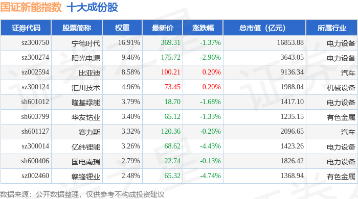 证券之星消息,12月29日,国证新能(399412)指数报收于2991.4点,跌1.34%,成交1015.06亿元,换手率1.36%。当日该指数成份股中,上涨的有9家,金风科技以10.01%的涨幅领涨,下跌的有40家,欣旺达以11.39%的跌幅领跌。