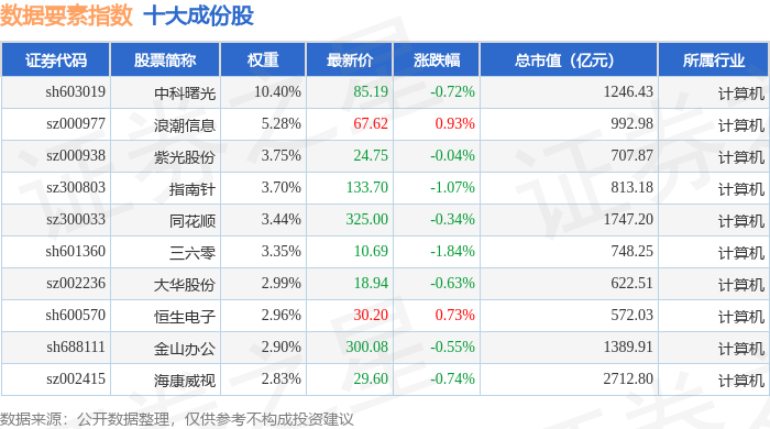 证券之星消息,12月29日,数据要素(399418)指数报收于4070.06点,涨0.19%,成交486.78亿元,换手率0.9%。当日该指数成份股中,上涨的有15家,拓维信息以10.0%的涨幅领涨,下跌的有35家,中国电信以2.18%的跌幅领跌。