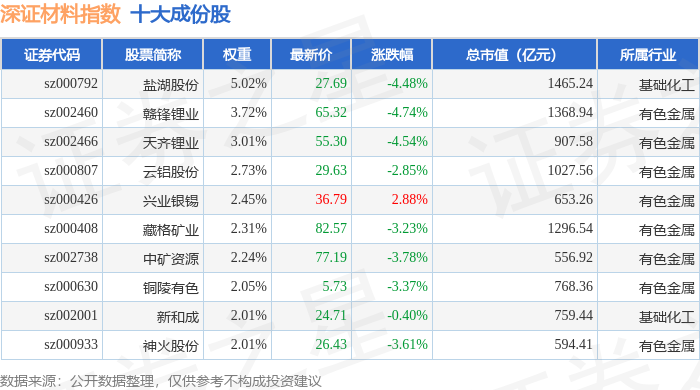 证券之星消息,12月29日,深证材料(399614)指数报收于3701.78点,跌1.37%,成交1192.13亿元,换手率2.65%。当日该指数成份股中,上涨的有42家,光威复材以14.86%的涨幅领涨,下跌的有77家,国城矿业以9.65%的跌幅领跌。