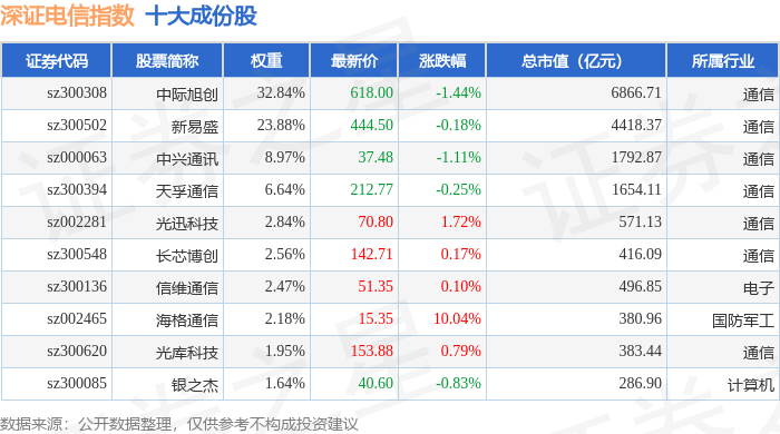 证券之星消息,12月29日,深证电信(399621)指数报收于12765.13点,涨0.05%,成交693.75亿元,换手率5.4%。当日该指数成份股中,上涨的有8家,海格通信以10.04%的涨幅领涨,下跌的有12家,华测导航以1.9%的跌幅领跌。