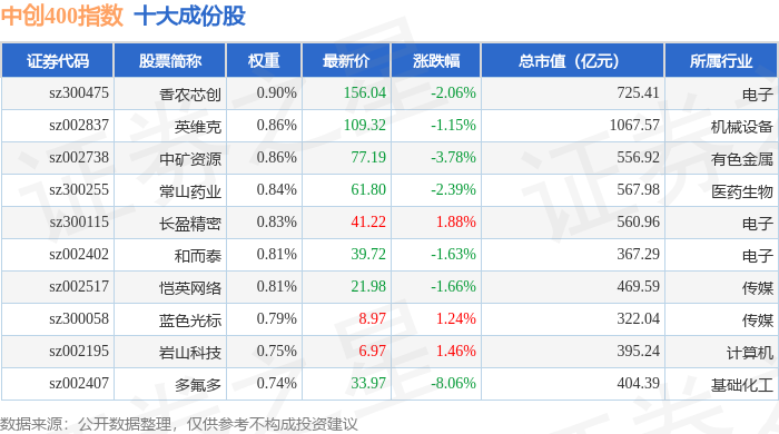 中创400(399624)指数十大成份股详情如下: