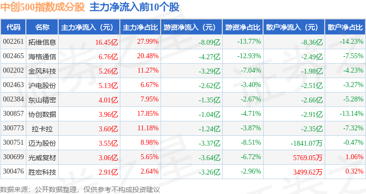 资金流向方面,中创500(399625)指数成份股当日主力资金净流出合计187.2亿元,游资资金净流入合计34.84亿元,散户资金净流入合计152.36亿元。成份股资金流向详情见下表: