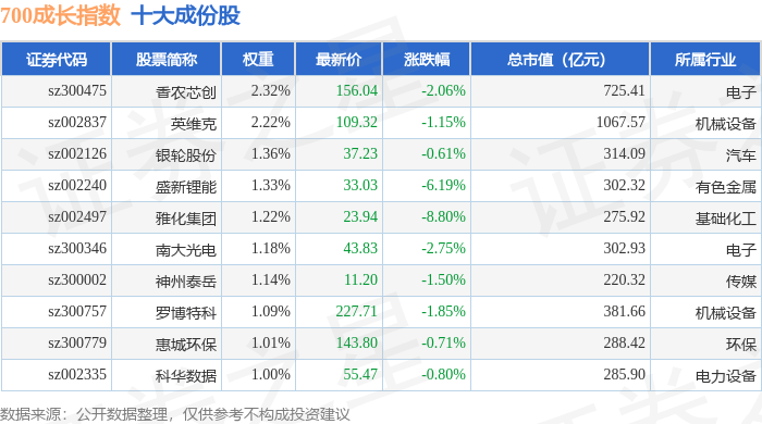 700成长(399628)指数十大成份股详情如下:
