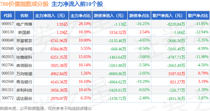 资金流向方面,700价值(399629)指数成份股当日主力资金净流出合计16.46亿元,游资资金净流入合计2.22亿元,散户资金净流入合计14.24亿元。成份股资金流向详情见下表: