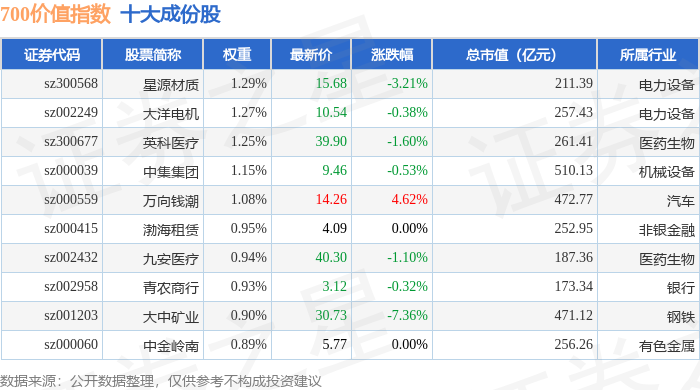 700价值(399629)指数十大成份股详情如下:
