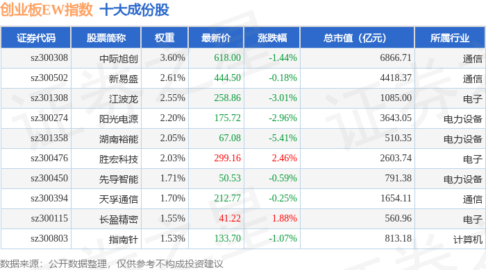 创业板EW(399635)指数十大成份股详情如下: