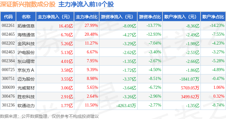 资金流向方面,深证新兴(399641)指数成份股当日主力资金净流出合计112.68亿元,游资资金净流入合计24.35亿元,散户资金净流入合计88.32亿元。成份股资金流向详情见下表: