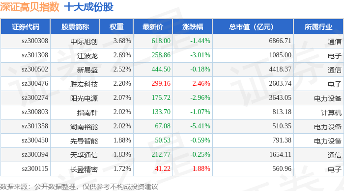 证券之星消息,12月29日,深证高贝(399662)指数报收于2454.87点,涨0.2%,成交2551.45亿元,换手率2.82%。当日该指数成份股中,上涨的有39家,迈为股份以20.0%的涨幅领涨,下跌的有59家,欣旺达以11.39%的跌幅领跌。