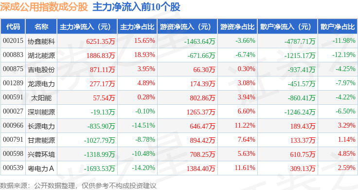 资金流向方面,深成公用(399689)指数成份股当日主力资金净流出合计2.97亿元,游资资金净流入合计2.39亿元,散户资金净流入合计5829.23万元。成份股资金流向详情见下表:
