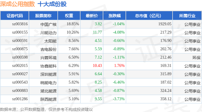 证券之星消息,12月29日,深成公用(399689)指数报收于844.78点,跌1.65%,成交40.17亿元,换手率0.67%。当日该指数成份股中,上涨的有1家,协鑫能科以1.76%的涨幅领涨,下跌的有15家,皖能电力以6.46%的跌幅领跌。